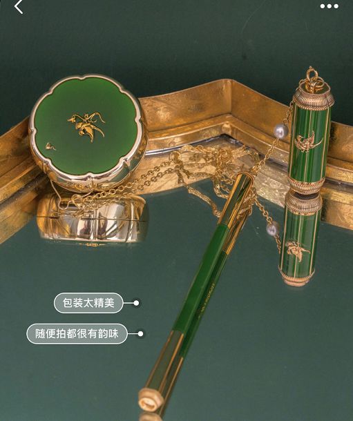 故宫联名本土化妆品牌"百雀羚"出了一套翡翠金化妆品套装,取名"雀鸟缠枝",寓意紫气东来、雀鸣祥瑞。下图右边的是口红,设计灵感来源于故宫的宫灯。