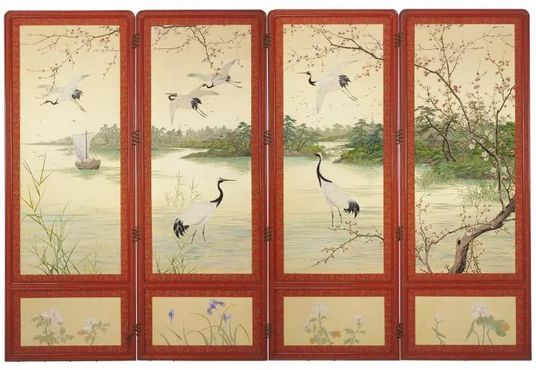 它设计元素来源于故宫珍藏文物:红漆边架缎地绣山水松鹤围屏。
