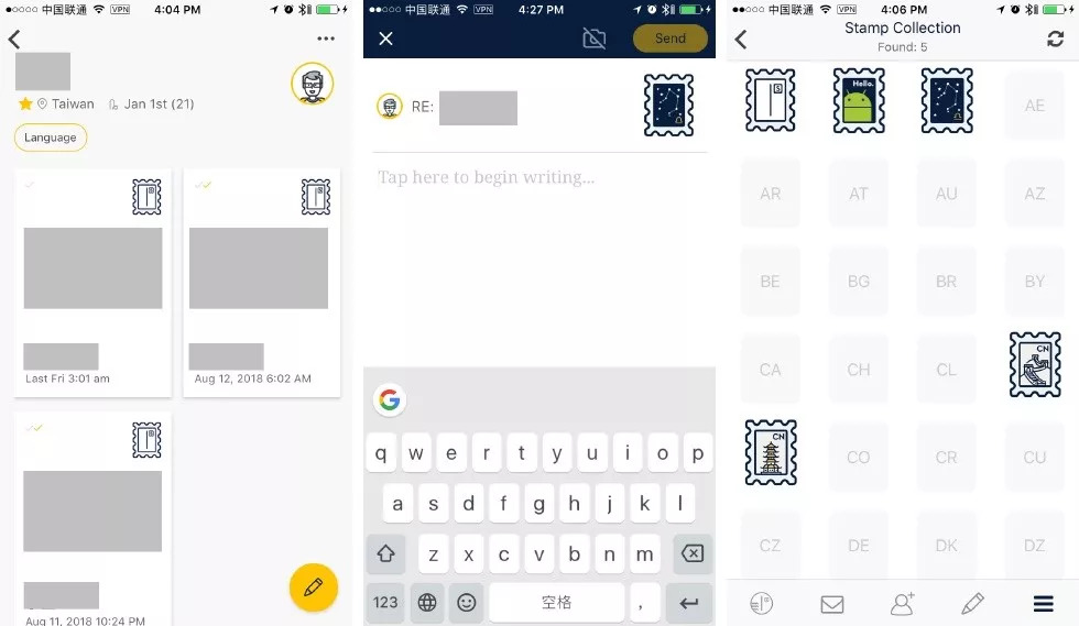 如果你没有认识的人想要寄出,完全可以交给系统按照你的偏好派发。作为一个工具+社交属性的产品,当然它也有关于用户偏好设置的社交标签功能,如果想被推荐到更合意的笔友,还要记得在偏好设置中认真选择自己感兴趣的话题、性别、年龄、掌握的语言等等,并且打开「自动匹配」。