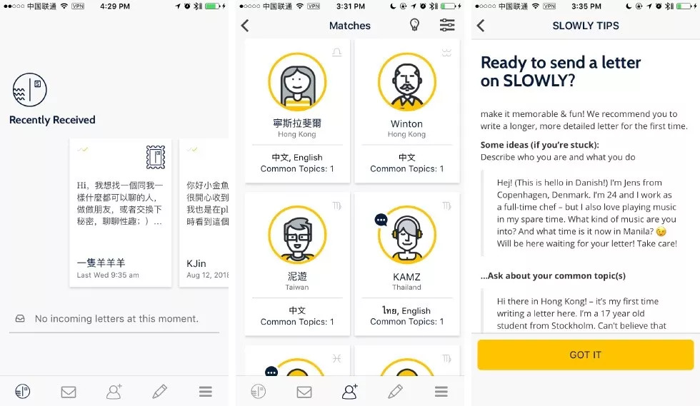 不难看出,在 SLOWLY,真的有寄信的感觉。它不像即时通讯那样能够「一秒即达」,而是双方的距离越远,所需要等待送到的时间就越久。上周晚上我发出了一封信,直到睡前查看都没有发出去,第二天早上才显示送达。直到现在,我还在等待那个有缘人回我,哪怕是写一句收到! 不过,这样一款产品的魅力不正是在于期待未知变化的慢动作吗?你也更容易发现生活其实会有更多的可能性…..