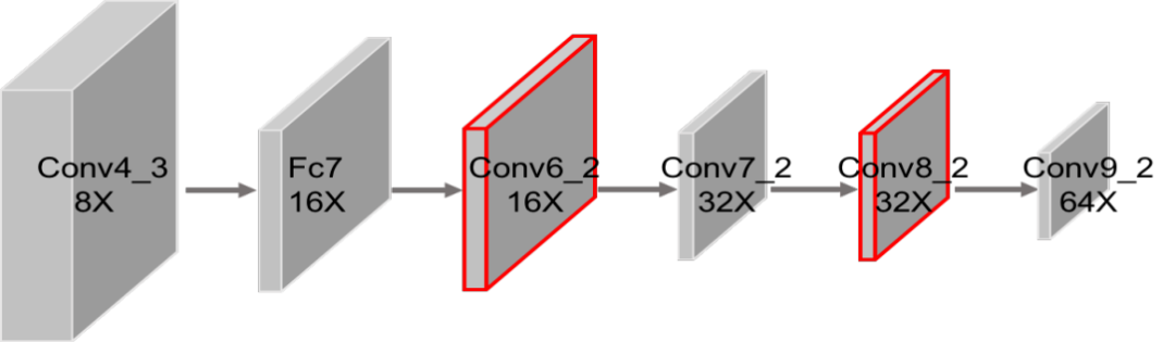 深度卷积神经网络通常是逐层下采样,这对于物体分类来说是有效的,但是对于检测任务来说是有损害的。基于时间和性能的权衡考量,我们对卷积网络中最后几层特征进行间隔采样,如图5,从Conv6_2层开始下采样,Conv7_2层保持原分辨率,Conv8_2层再下采样。