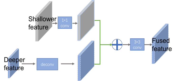 高层和低层特征融合策略如图6所示,高层特征图先进行上采样使之与低层特征图相同大小,然后与低层特征图进行叠加,叠加后的特征图再连接一个3*3卷积,获得固定维度的特征图,我们设定固定维度d=256。