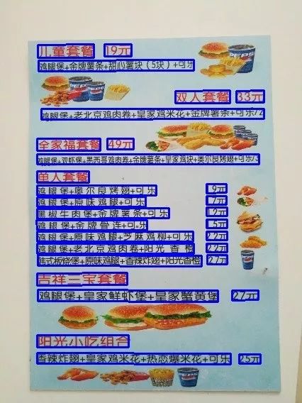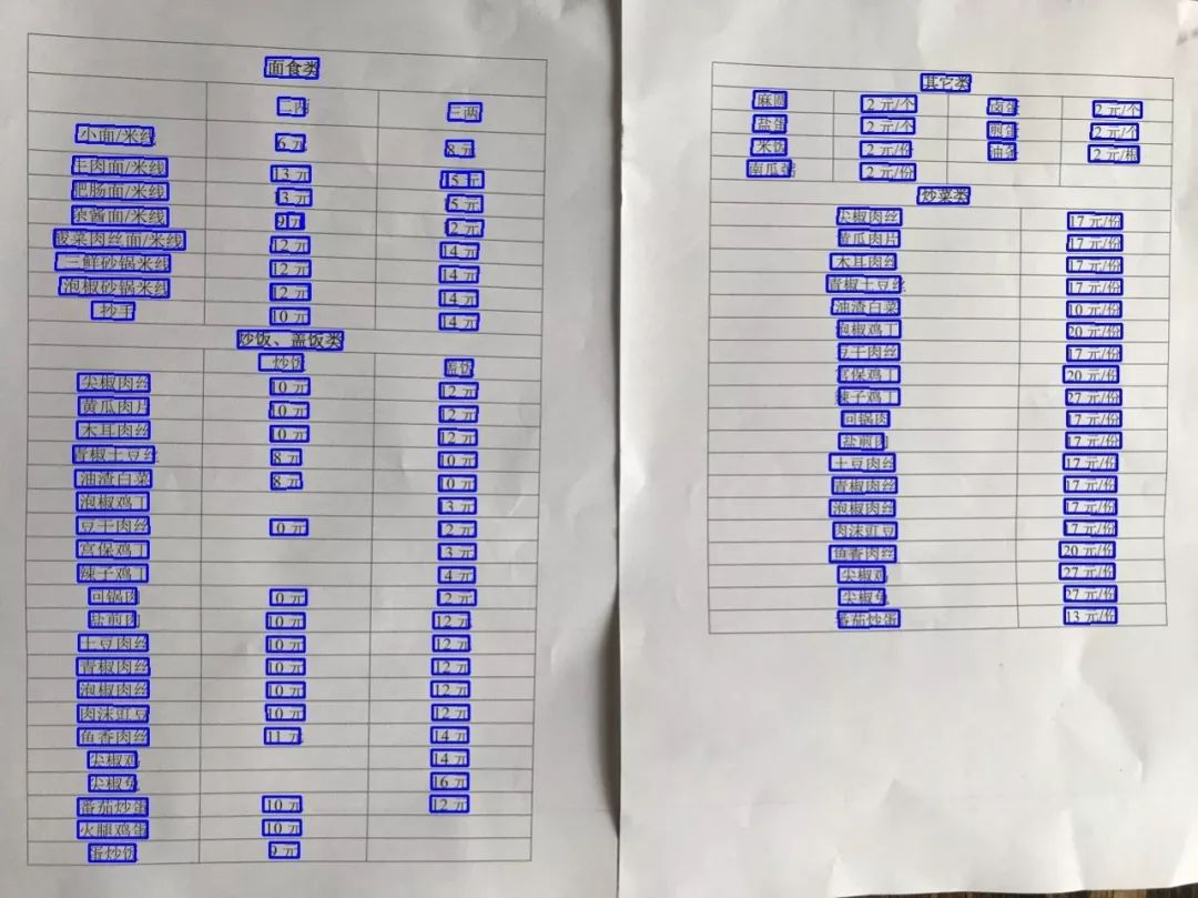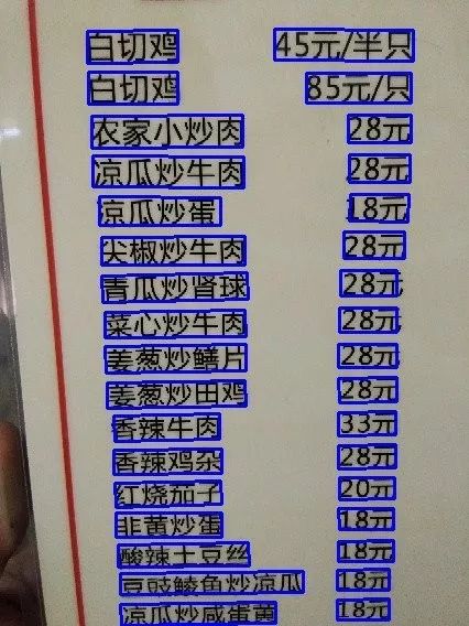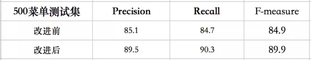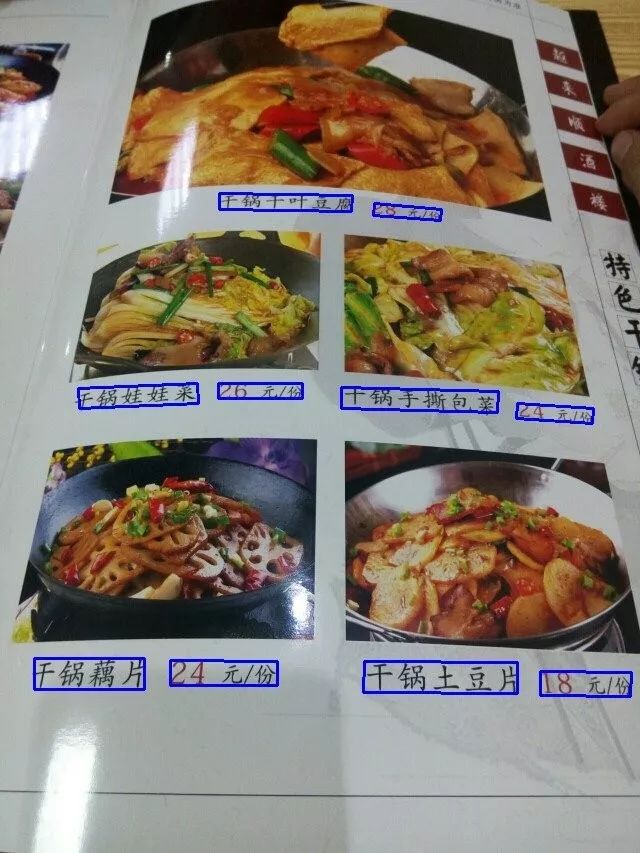 (3)此外,本方法也落地应用于实际业务场景菜单识别中。菜单上文字通常较小、较密,菜名文字可长可短,以及由于拍摄角度导致文字方向倾斜等。如图11所示,方法能很好的解决以上问题(小文字、密集文字行、长文本、不同方向);并且在500张真实商家菜单图片上进行评测,相比SegLink方法,性能明显提升(近5个点提升)。