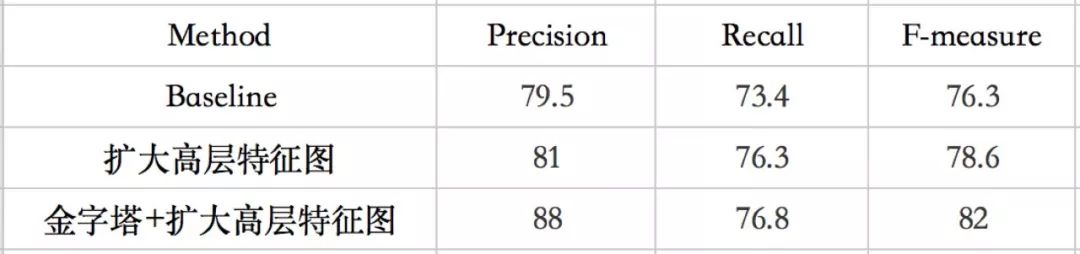 (1)我们首先对比了扩大高层特征图与不扩大高层特征图的性能比较,并在基础上对比加入特征金字塔后的性能比较,在ICDAR2015数据集上实验,结果如表1: