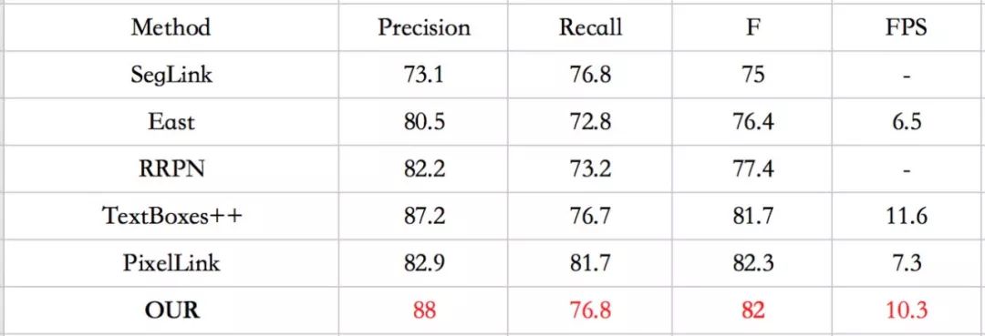 “BaseLine”方法是SSD框架+预测文字片段及片段之间连接关系模块,“扩大高层特征图”是在BaseLine方法基础上对高层特征图进行扩大,“金字塔+扩大高层特征图”是在BaseLine方法基础上对高层特征图进行扩大 并且加入特征金字塔。从表1中不难发现,扩大高层特征图可以带来精度和召回的提升,尤其是召回有近3个点的提升(73.4->76.3),这很好理解,因为更大的特征图产生更多的特征点以及预测结果;在此基础上再加入金字塔机制,精度获得显著提升,说明金字塔结构极大增强低层特征判别能力。