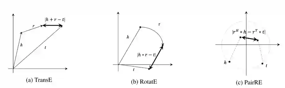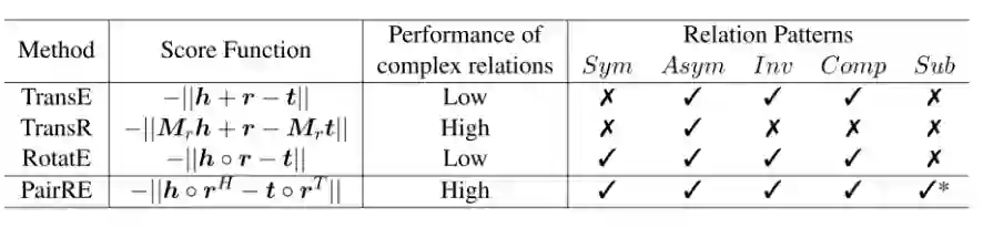 之前的TransH、TransD和TransR等方法致力于解决复杂关系表示问题,却只能编码对称/非对称关系,最新的RotatE在编码对称/非对称关系,逆向关系和组合关系上取得了优异的效果,但是复杂关系的预测依然具有挑战性。由此,论文提出了一种新的知识图谱嵌入方法PairRE,它能够同时编码复杂的关系和多种关系模式。