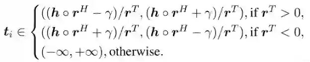 相比于其他方法,PairRE允许一个实体在不同的关系中有分布式表示,并且成对的关系向量能够对损失函数中的边际进行自适应调整,从而缓解复杂关系的表示问题。例如在1对N的关系补全(h, r, ?)中,由正确的尾实体集合S = {t_1,t_2,…,t_N},论文基于固定边际参数γ的设计了t_i的取值范围: