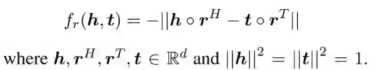 模型中使用的两个用于关系表示的向量将头尾实体分别投影到欧式空间,再最小化投影向量的距离。其形式化描述如下: