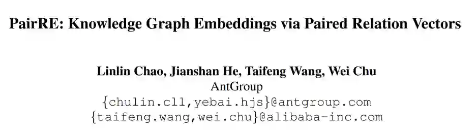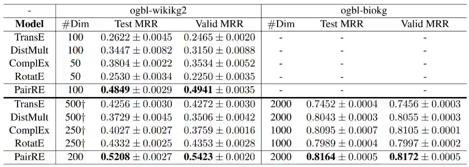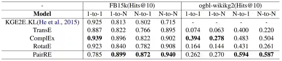 论文提出的PairRE方法用成对的向量表示每个关系,使损失函数中的余量能够自适应调整,以适应不同的复杂关系,在复杂度略有增加的情况下有效地解决了知识图谱嵌入中的问题。除了对称/不对称、逆向和组合关系之外,PairRE还可以通过对关系表示的简单约束编码子关系。在大规模数据集ogbl-wikikg2上,PairRE取得了最优效果。