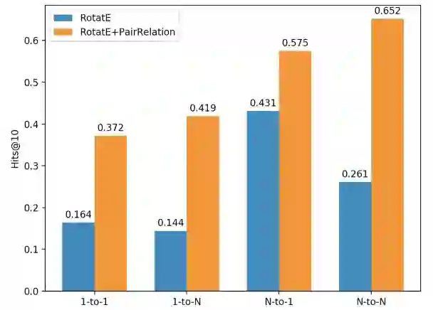 上图是本文的主实验结果,可以看到Pair相比于RotatE在各个设定下都取得了更好的效果,如果嵌入向量的维度能够升高到500,效果可能会进一步提升。