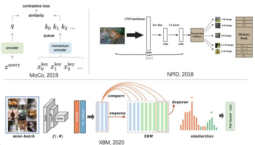 此外,我着重推荐一些我非常喜欢的一些memory bank相关的工作。memory bank的思想是通过一个特征队列来记忆过去大量的特征,并和当前特征组成海量的特征对来提升模型的表征能力。