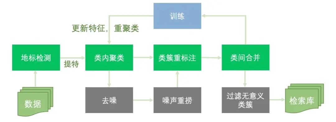 使用基于开源数据集训练的分类模型对地标图片进行提特后,我们对同一类目下的所有样本进行DBSCAN聚类,目的是用来去除同类目下的离群(噪声)样本,同时把同类目(A)下图片聚成多个类簇来重标注为多个子类(a1, a2,...),用于后续的模型训练。