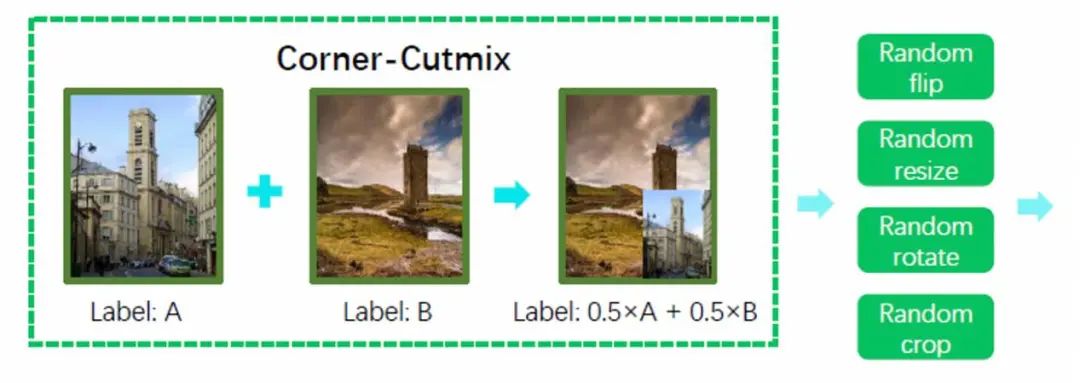 结合地标图像的多遮挡、多尺度、多目标的特点,我们简化了CutMix的操作,简单地把把图像A的原图进行缩放,并遮挡到图像B的任意一个角落上,生成了一个有多目标物的地标图。