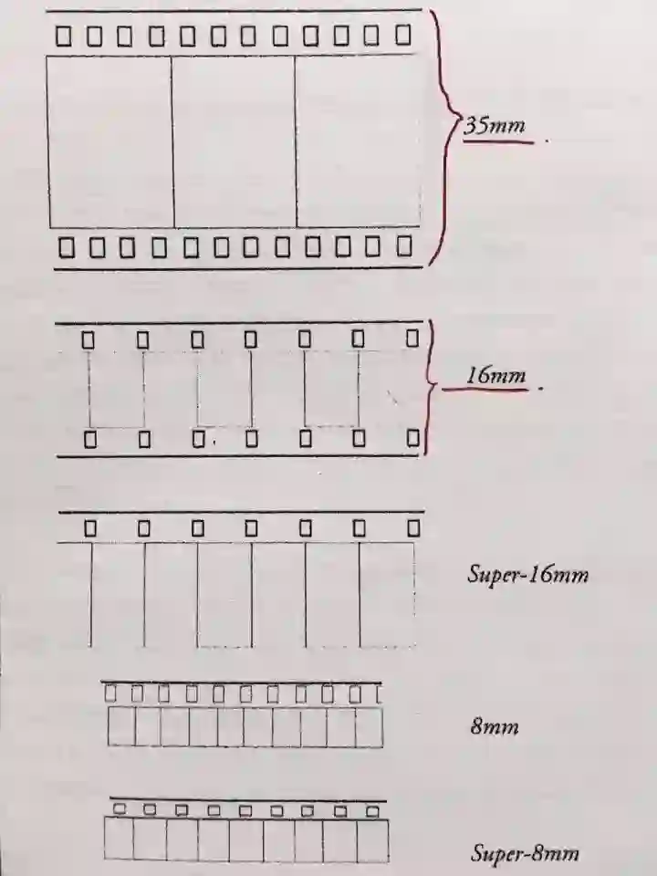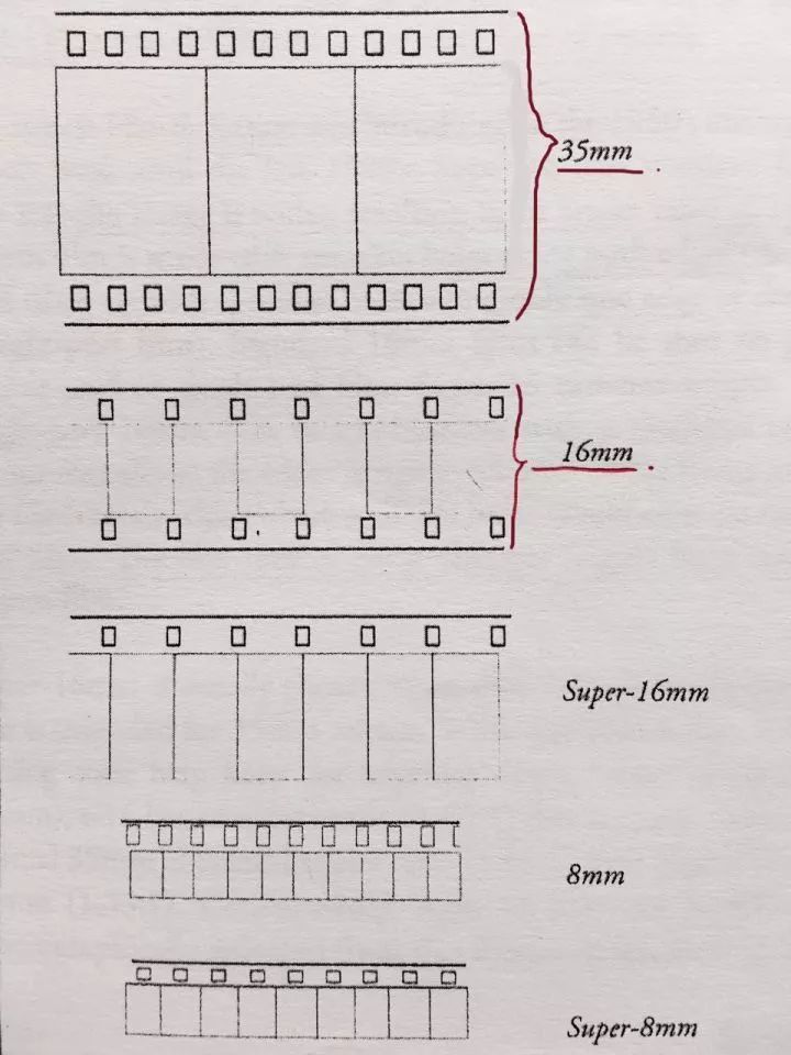 5.画幅:这里需要借助“胶片格式”来更好地理解画幅的概念。常见的胶片格式有16mm、35mm、65mm、70mm。这里的毫米数指的是包含了两侧带孔部分的胶片宽度,画幅则指的是不包含带孔部分的长方形大小(即每一帧画面的大小,如下图)。
