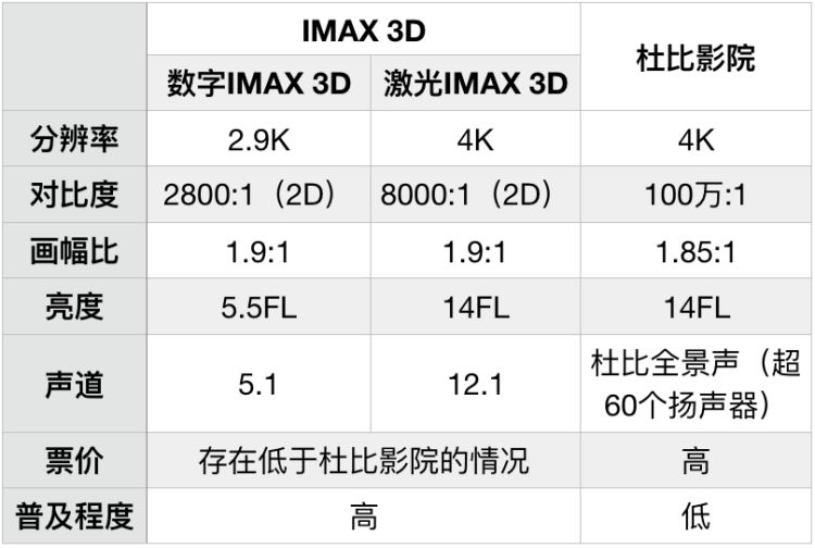 分辨率方面,数字IMAX 3D拷贝理论上为2.9K分辨率,激光IMAX 3D为4K;亮度方面,数字IMAX 3D的亮度为5.5FL,激光IMAX 3D为14FL;对比度方面,数字IMAX 2D的对比度为2800:1,激光IMAX 2D的对比度为8000:1(仅做参考,3D版暂无数据);音频方面,数字IMAX普遍为5.1声道,激光IMAX则为12.1声道。