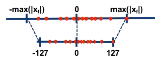 简单的将一个 tensor 中的 -max(|X|) 和 max(|X|) FP32 value 映射为 -127 和 127 ,中间值按照线性关系进行映射,称这种映射关系是对称量化。