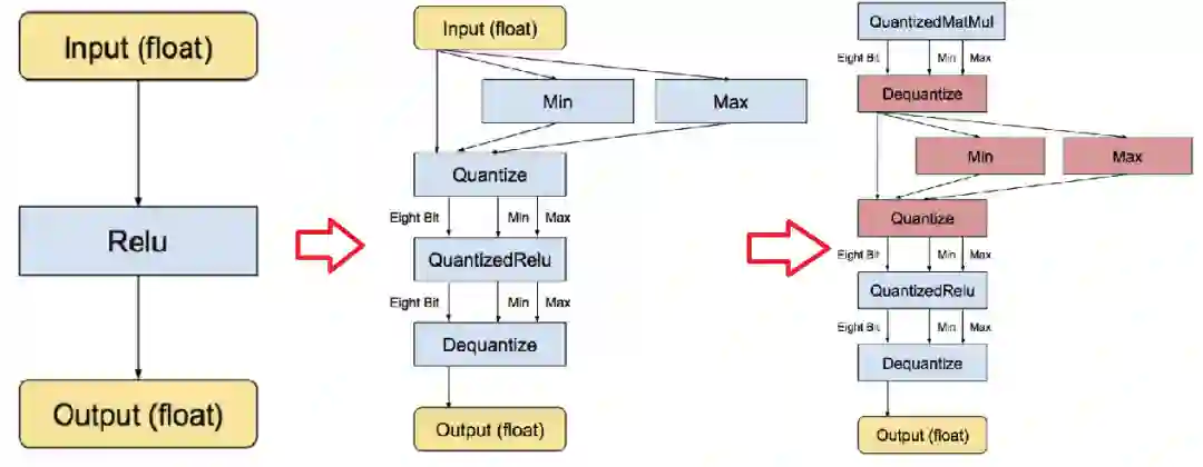 量化后的 𝑸 还是反推求得的浮点值 R,若它们超出各自可表示的最大范围,则需进行截断处理。特别说明:一是浮点值 0 在神经网络里有着举足轻重的意义,比如 padding 就是用的 0,因而必须有精确的整型值来对应浮点值 0。二是以往一般使用 uint8 进行定点量化,而目前有提供 float16 和 int8 等定点量化方法,而 int8 定点量化针对不同的数据有不同的范围定义。深度模型的前向推导通过量化实现 8-bit 版本运算符(包括卷积、矩阵乘、激活函数、下采样和拼接)运行;同时,量化对象包含实数与矩阵乘法等类型。则以激活函数 Relu 为例,传统、实数量化、矩阵乘法量化等三种前向推导流程如图 4 所示。