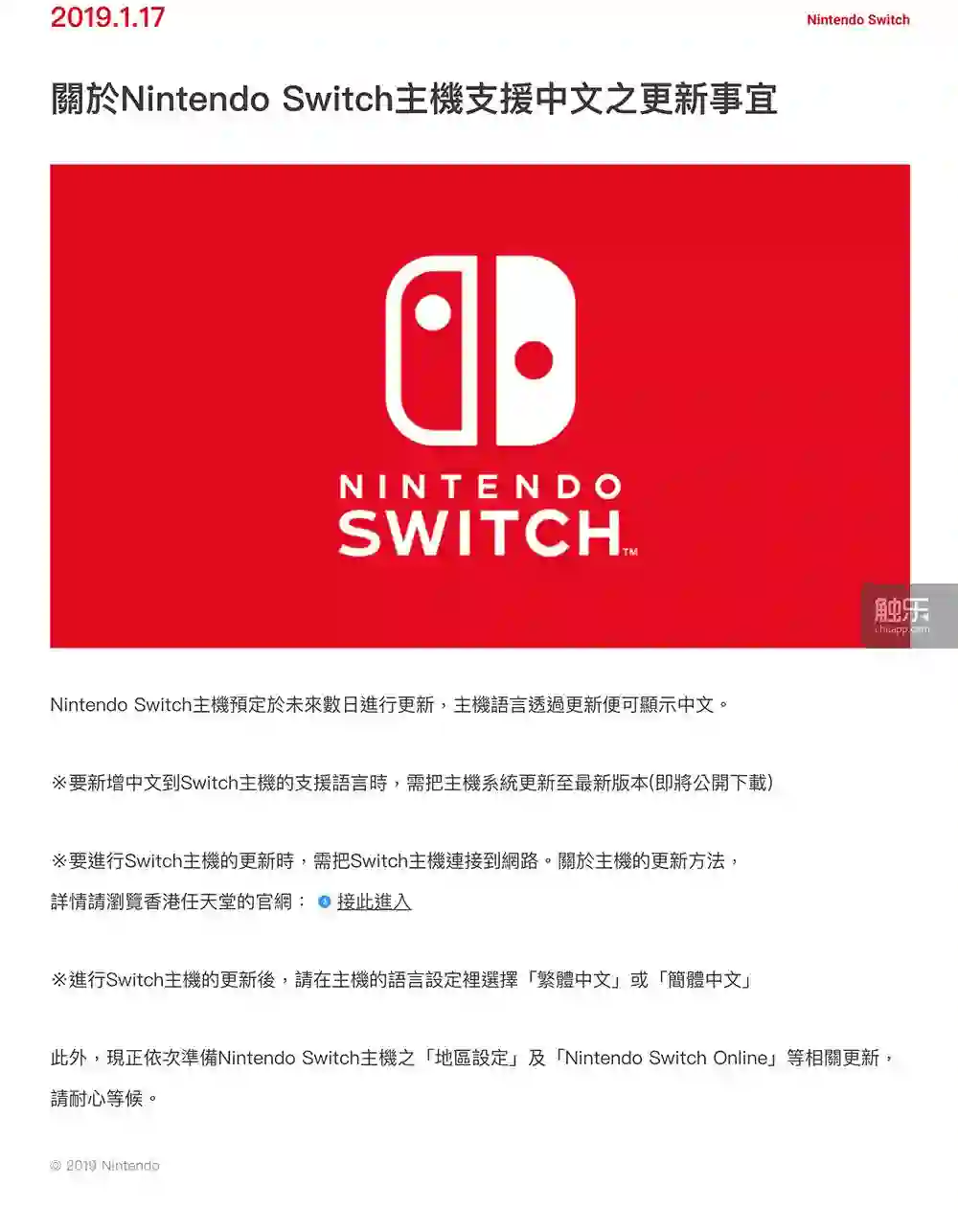 这个话题源自任天堂中国香港官网发布的一条公告:Nintendo Switch主机将于近期更新,更新后的主机语言可以显示中文。玩家将Switch系统更新至最新版本后,即可在主机语言设定里选择繁体中文或简体中文。