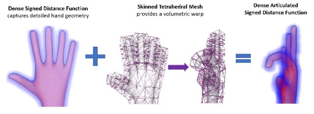 太过详细的手部模型而导致的巨大运算量,而为了尽可能地实现高帧率的手部动作识别,他们使用四面体蒙皮网格,创建一个有关符号(即手的内部还是外部)的距离场,在图中以蓝色或红色表示。接下来对于任何的手部姿态,产生一个到详细曲面几何体的距离并执行基于梯度优化导数的封闭形式计算。