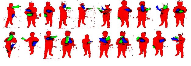 上图一些将左右手分割的示例,其中蓝色表示左手,绿色表示右手,黑色不太确定。通过混合基于学习的手势估计办法和显式手部运动学以及表面几何生成模型,产生最终的手部追踪系统。