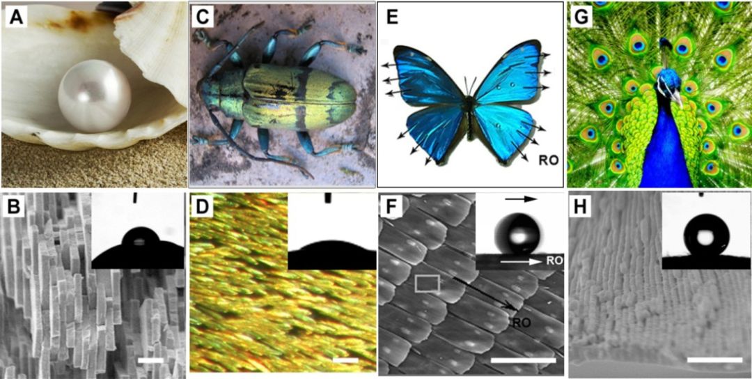 珍珠(A, B),甲虫背部(C, D),蝴蝶翅膀(E, F),孔雀羽毛(G, H)
