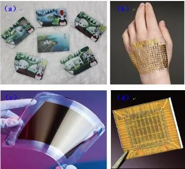 (a)APEC 会议门卡;(b)可穿戴传感器;(c)柔性晶体管;(d)微纳电子电路
