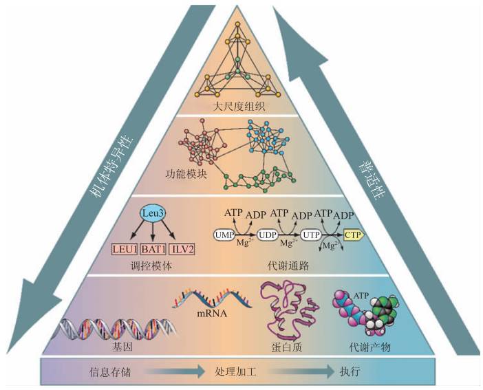 一批“不安分”的物理学家的研究触角在过去30 多年里还延伸到物理学和生物学等传统自然学科以外的生态学、经济学、社会科学等诸多领域。自1998 年和1999 年的小世界网络和无标度网络提出以来,复杂网络研究成为复杂系统研究的焦点,网络科学本身逐渐建立起来,建立了复杂系统研究的新思路,它反过来又对其他具体学科起到了反哺作用。在此过程中,生命现象的研究获益良多,以复杂网络思想构建的基因调控网络、蛋白质作用网络、新陈代谢网络、神经网络和脑网络等大大加深了人们对不同层面生命涌现的理解,构筑起生命现象的网络金字塔(图4)。综合老三论(系统论、控制论和信息论)、新三论(耗散结构论、协同论、突变论)、非线性动力学理论和复杂网络理论,系统科学作为一门处于方法论层次的学科逐步建立起来,它强调将物理学家惯用的还原论和整体论有机结合来对付复杂系统。系统生物学就是系统科学的成功实践。