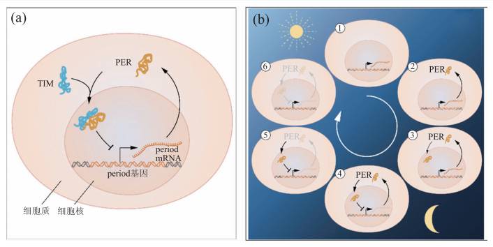 图3 (a)昼夜节律钟分子组成的简单图示;(b)以昼夜节律为例的节律基因反馈调节机制的简单图示