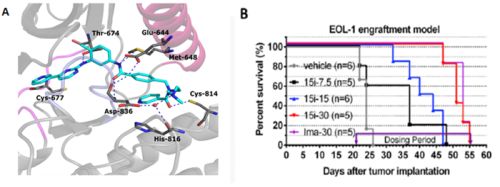 针对这一现状,研究团队采用以结构为基础的药物设计的理念,发展了高活性高选择性的新一代PDGFRa抑制剂CHMFL-PDGFRα-159。其能够有效抑制激酶PDGFRα的磷酸化(IC50=132nM),并对与之同家族的PDGFRb激酶,以及目前临床上使用的药物格列卫的作用靶点ABL,c-KIT等都没有明显的抑制活性。进一步针对人类468种激酶的结合强度测试结果显示CHMFL-PDGFRα-159在激酶组也具有极高的选择性(S score(10)=0.02)。北京大学医学部的云彩虹课题组使用X-ray晶体结构衍射的方法显示,该抑制剂的超强选择性是由于其采用的特异性的结合模式所致。此外,CHMFL-PDGFRα-159能够有效抑制慢性嗜酸粒细胞白血病细胞系EOL-1中的PDGFRα相关信号通路的传导并诱导细胞凋亡和细胞周期阻滞;针对小鼠慢性嗜酸粒细胞白血病的移植瘤模型和原位瘤模型,CHMFL-PDGFRα-159展示出强有效的肿瘤抑制作用以及生命周期的延长效果。