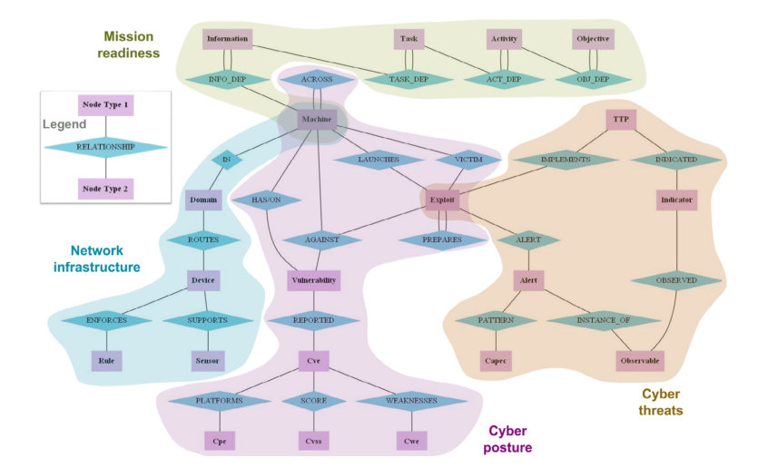 由MITRE 公司推出的 Cygraph 网络安全态势分析图谱,从网络架构(Network Infrastructure)、安全状态(Security Posture)、网络威胁(Cyber Threats)、任务准备(Mission Readiness)四个层次构建知识图谱,用于支持针对关键资产保护的攻击面识别和攻击态势理解等任务。