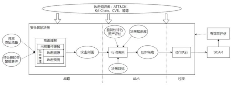 安全智能决策模块首先对待处理的告警或事件进行攻击理解,借助已有的知识库了解当 前攻击的阶段、严重程度等等,借助原始日志和全流量等数据进行攻击事件调查,得到更多 被感染的机器,并且利用提前建立的预测模型,预测下一次攻击事件的类型和严重程度,通 过攻击理解模块,可以获取对当前攻击事件的完整刻画,包括当前事件、由当前事件引起的 其他事件以及将来可能发生的事件,即得到战略层面的信息。