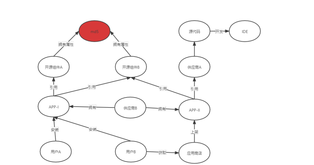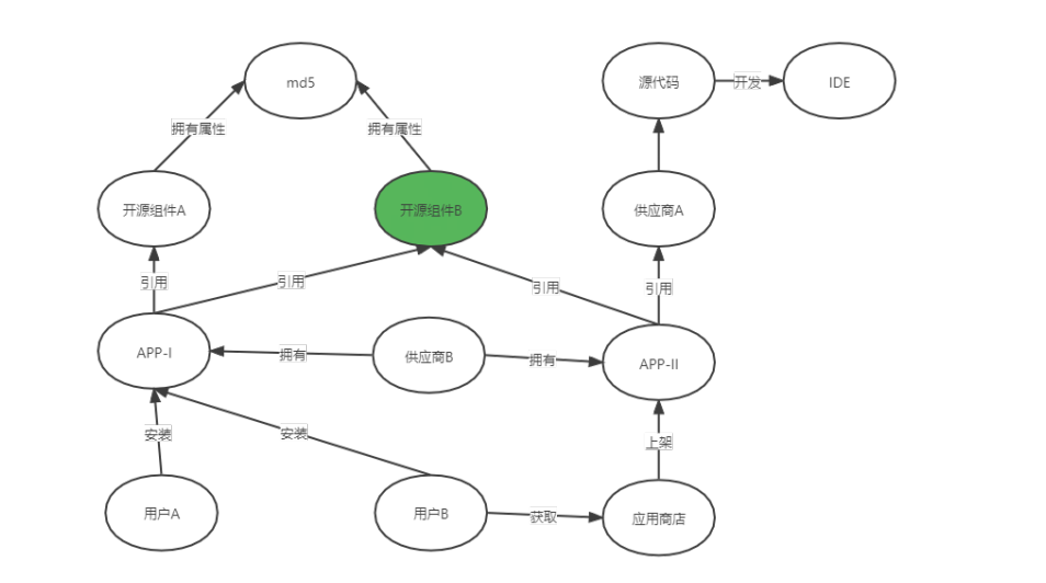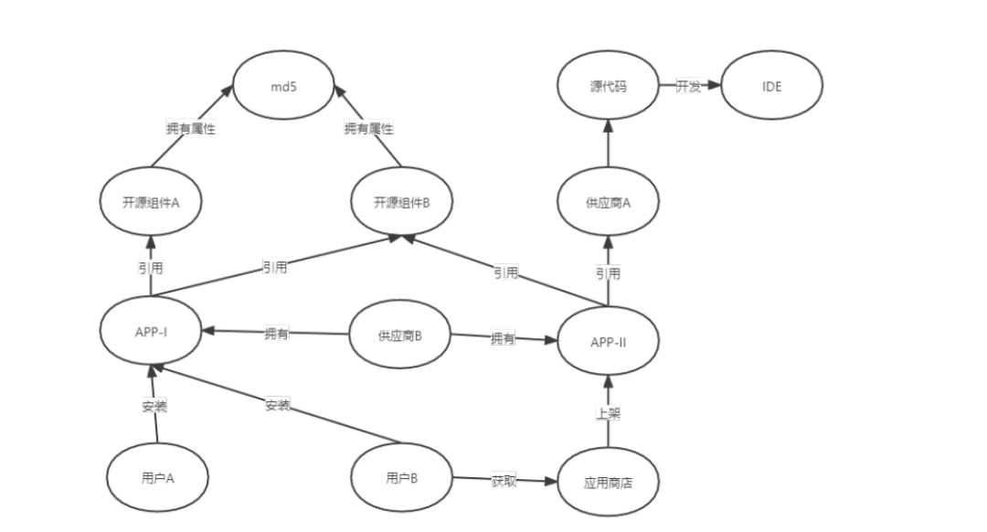 软件供应链有一个很明显的特征,即引用关系链特别长。那么一旦某个节点被爆出存在 安全隐患,可根据知识图谱快速梳理出受影响的对象。如下图示例,用户 A 安装了 APP-I, 而 APP-I 引用了开源组件 A 和开源组件 B。若开源组件 A 存在安全漏洞,则会影响用户 A。而知识图谱的边,正好可以体现出这种引用关系,适合于软件供应链安全中的多级依赖场景。通过深度搜索,提取特征,可作为风险模型的输入。