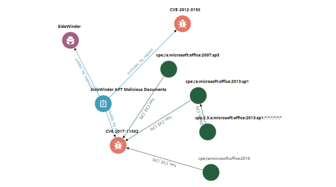 如下图所示, office2007、 2013 和 2016 都有 CVE-2017-111882 漏洞,被 Sidwinder 组织 在某次 APT 攻击战役中使用。通过组件的引用关系,就可以识别受到影响的终端。