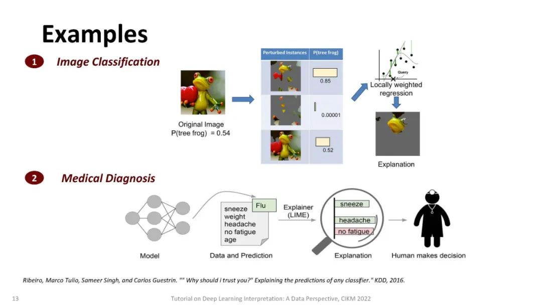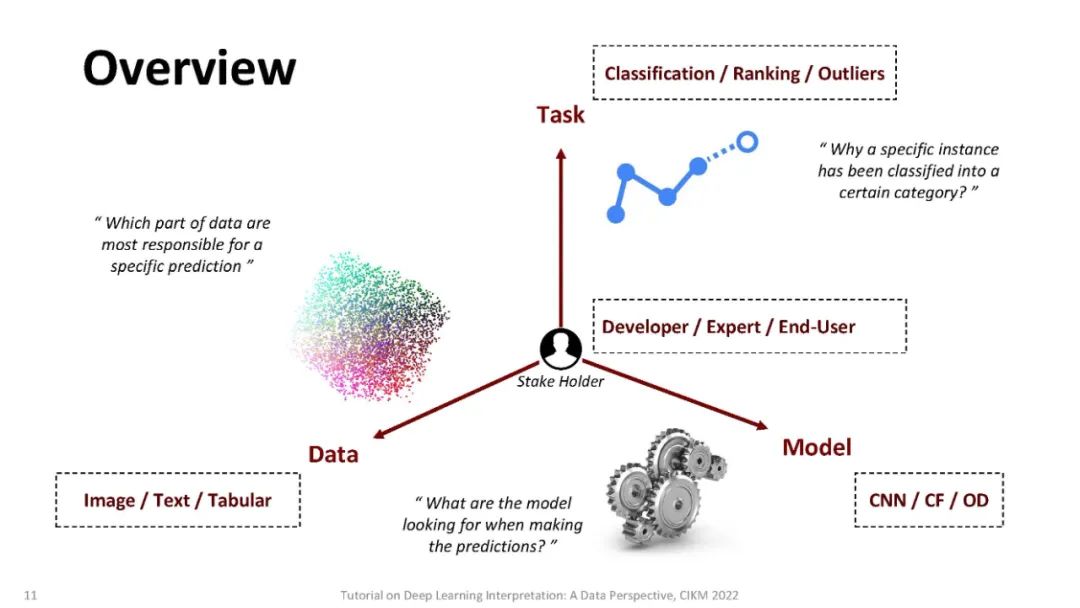 深度学习模型在从计算机视觉、自然语言处理到图形挖掘等各种任务中都取得了卓越的预测性能。许多不同领域的企业和组织正在构建基于深度学习的大规模应用程序。然而,人们越来越关注这些模型的公平性、安全性和可信性,这主要是由于其决策过程的不透明性质。最近,人们对可解释深度学习越来越感兴趣,它旨在通过解释模型的行为、预测或两者都解释来减少模型的不透明度,从而在人类和复杂深度学习模型之间建立信任。近年来,针对模型的低可解释性和不透明性问题,提出了一系列的解释方法。在本教程中,我们将从数据的角度介绍最近的解释方法,针对分别处理图像数据、文本数据和图形数据的模型。我们将比较它们的优势和局限性,并提供实际应用。