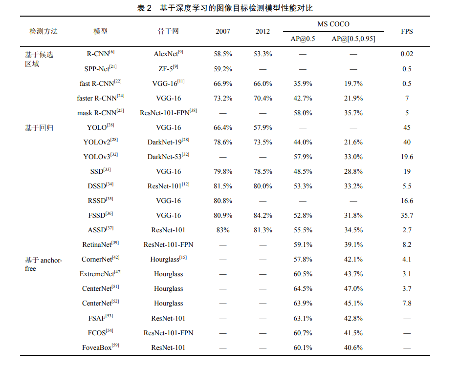 本节将介绍近几年提出的基于候选区域、回 归和 anchor-free 的图像目标检测模型,总结各模 型相比之前模型的改进策略以及自身的创新点和 不足,并在 PASCAL VOC2007[17] 、 PASCAL VOC2012[17]和 MS COCO[18]等常用公共数据集上 做出比较。