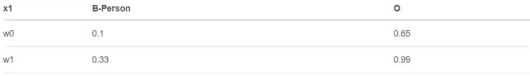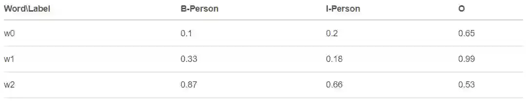 假设在我们的数据集中,我们只有一种类型的命名实体PERSON,因此我们实际上有三个标签(不包括开始和结束):B-PERSON、I-PERSON和O。