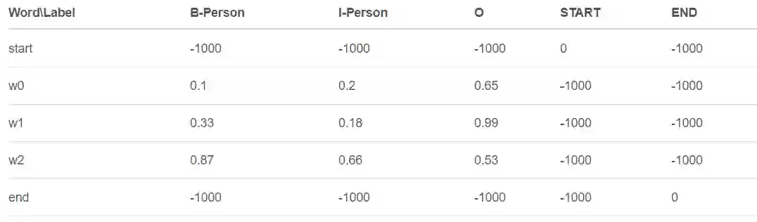 如上表所示,我们通过添加两个单词(start和end)及其对应的标签(START和END)来扩展排放emission矩阵。BiLSTM层的输出不包括新增单词的emission分数,但是我们可以手动指定这些分数(即