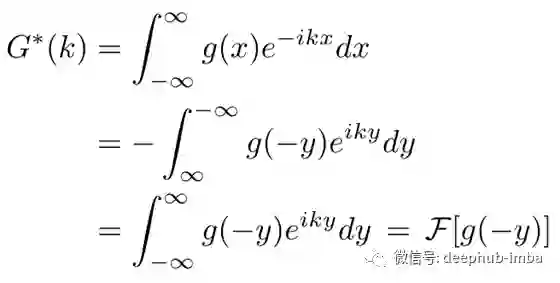 取G的复共轭。请注意,内核g(x)是实值,因此不受共轭影响。然后,更改变量(y = -x)并简化表达式。
