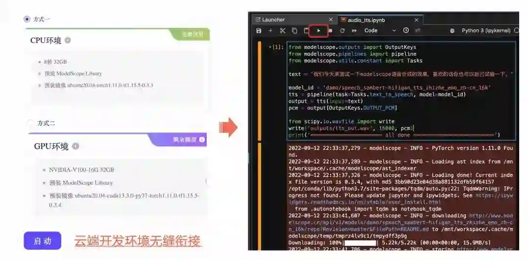 模型的开发离不开算力,魔搭社区的生态和云的生态实现了无缝的集成。阿里云为魔搭社区提供了一定的免费的算力,来促进社区的快速发展。同时魔搭社区和多种云产品结合,如阿里云弹性加速计算EAIS和机器学习平台PAI,覆盖了模型的开发的方方面面。从魔搭社区,用户们可以进行开发,并能够快速的连接到云生态。能够完善今天整个模型的开发的链路。