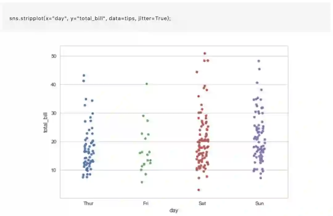 在条纹图中,散点图通常将重叠。这使得很难看到数据的完整分布。一个简单的解决方案是使用一些随机的 “抖动” 调整位置(仅沿着分类轴)