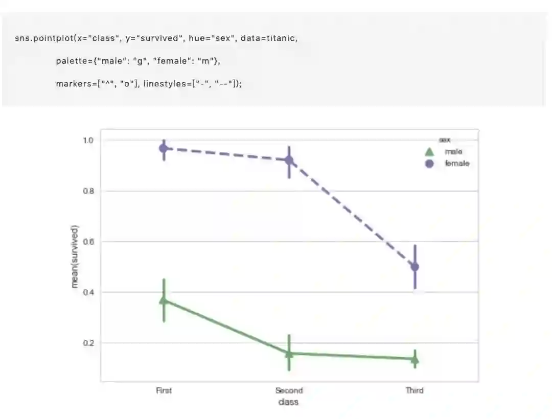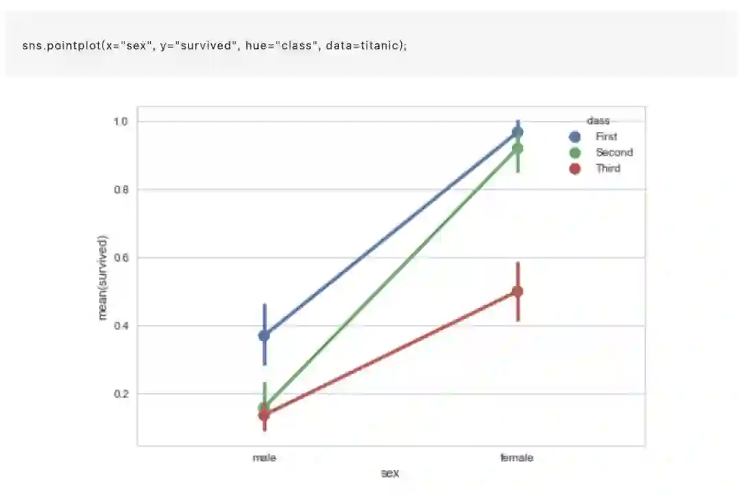pointplot() 函数提供了可视化相同信息的另一种风格。该函数还对另一轴的高度估计值进行编码,而不是显示一个完整的柱型,它只绘制点估计和置信区间。另外,点图连接相同 hue 类别的点。这使得很容易看出主要关系如何随着第二个变量的变化而变化,因为你的眼睛很好地收集斜率的差异: