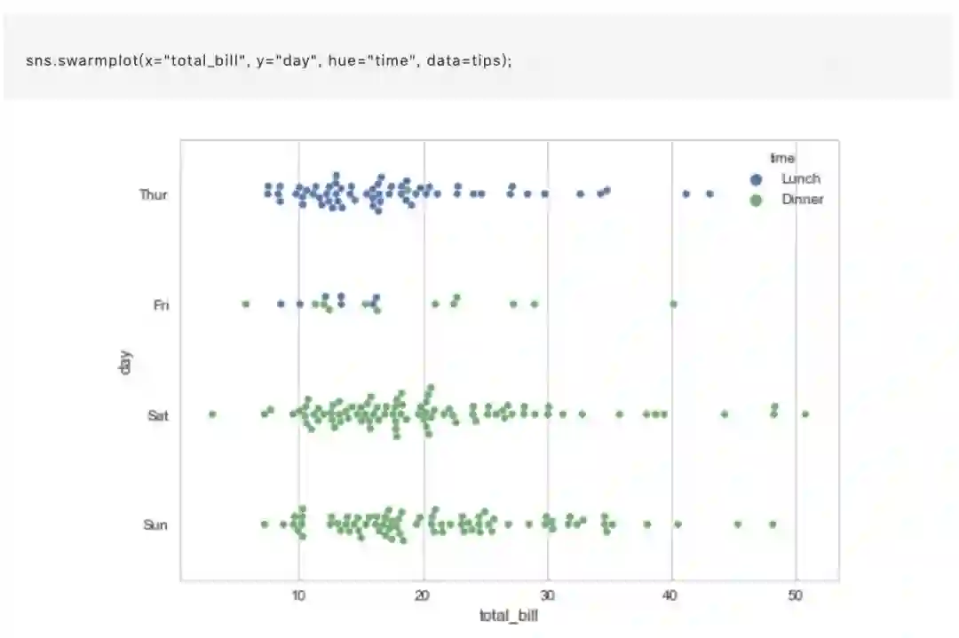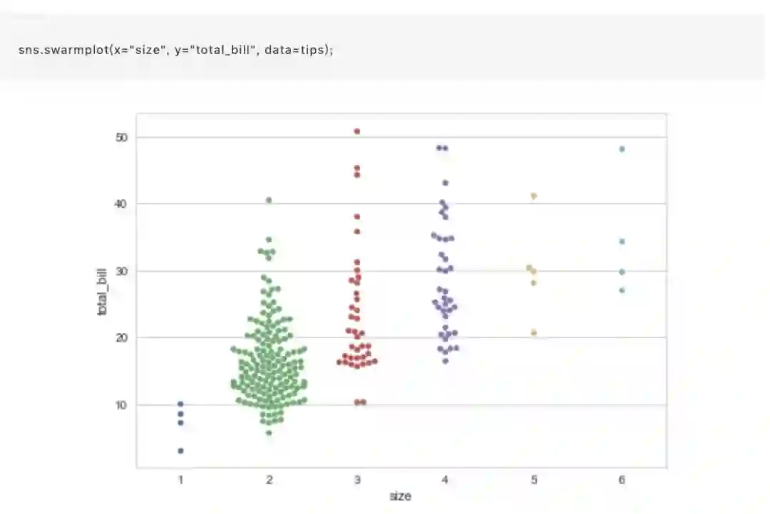 不同的方法是使用函数 swarmplot(),它使用避免重叠点的算法将分类轴上的每个散点图点定位: