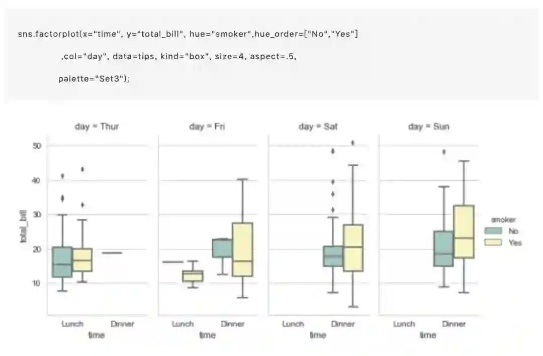 重要的是要注意,你也可以直接使用 boxplot() 和 FacetGrid 来制作这个图。但是,必须特别注意确保分类变量的顺序在每个方面实施,方法是使用具有 Categorical 数据类型的数据或通过命令和 hue_order。