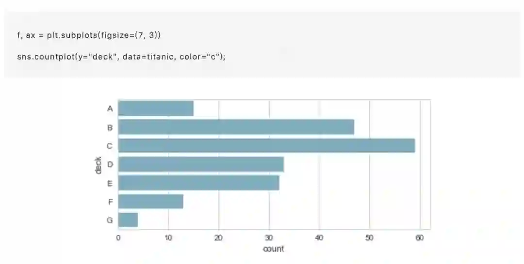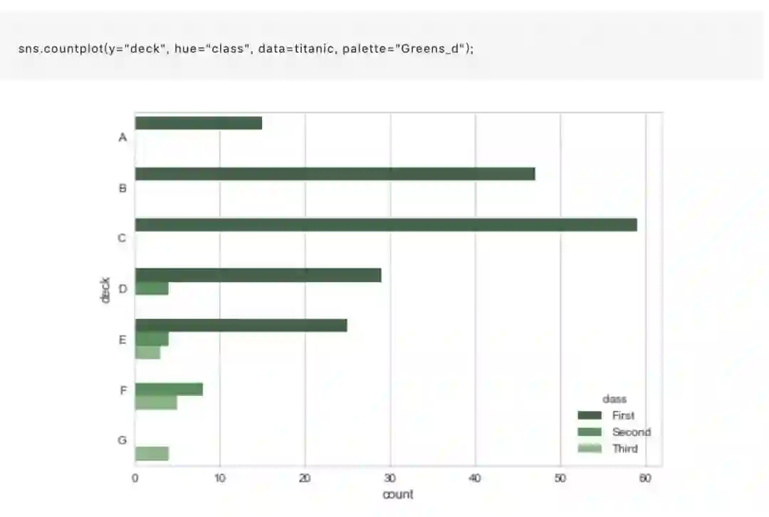 条形图的特殊情况是当您想要显示每个类别中的观察次数,而不是计算第二个变量的统计量。这类似于分类而不是定量变量的直方图。在 Seaborn 中,使用 countplot() 函数很容易绘制: