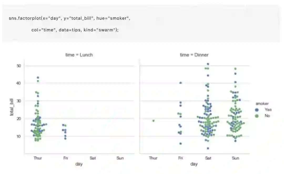 这与之前的 regplot() 和 lmplot() 的关系非常相似(未禾备注:在 seaborn 的构架中很容易分成这样两类用途相似,使用有所差异的替代方案函数)。在 Seaborn 中,相对低级别和相对高级别的方法用于定制分类数据的绘制图,上面列出的函数都是低级别的,他们绘制在特定的 matplotlib 轴上。还有更高级别的 factorplot()(未禾备注:这是一个非常简明的快速绘制函数,具体用法会在最后有详细介绍),它将这些功能与 FacetGrid 结合,以便在面板的网格中应用分类图像。