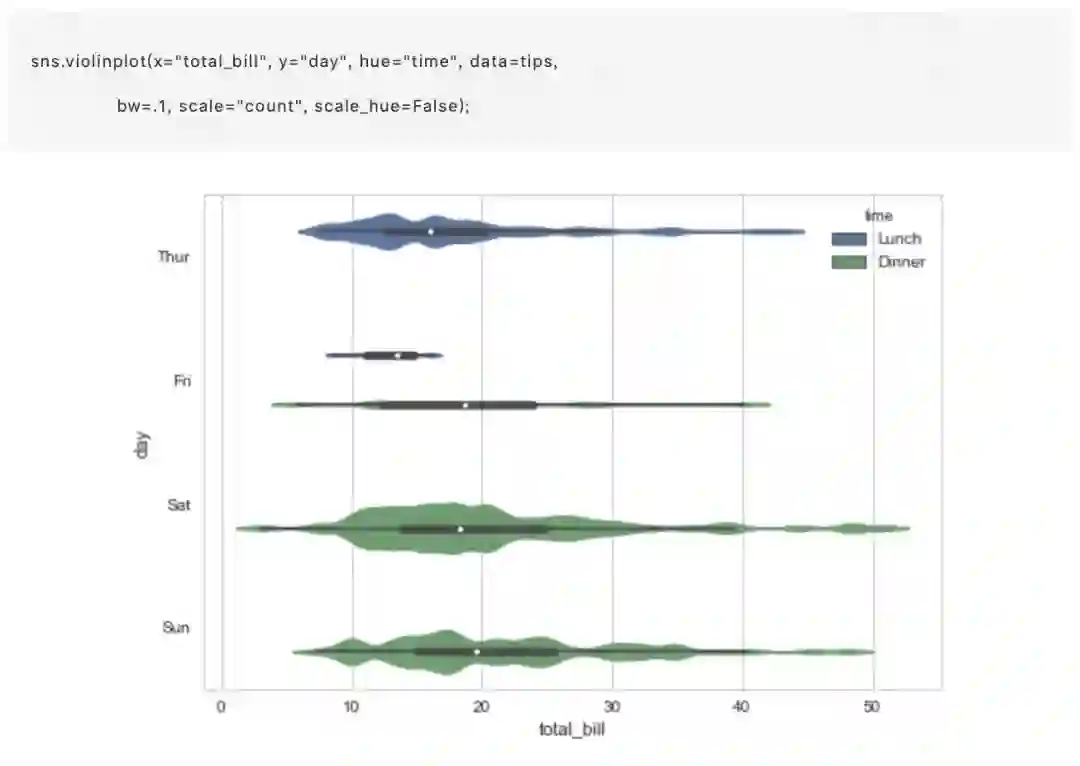 这种方法使用核密度估计来更好地描述值的分布。此外,小提琴内还显示了箱体四分位数和晶须值。由于小提琴使用 KDE,还有一些其他可以调整的参数,相对于简单的 boxplot 增加了一些复杂性: