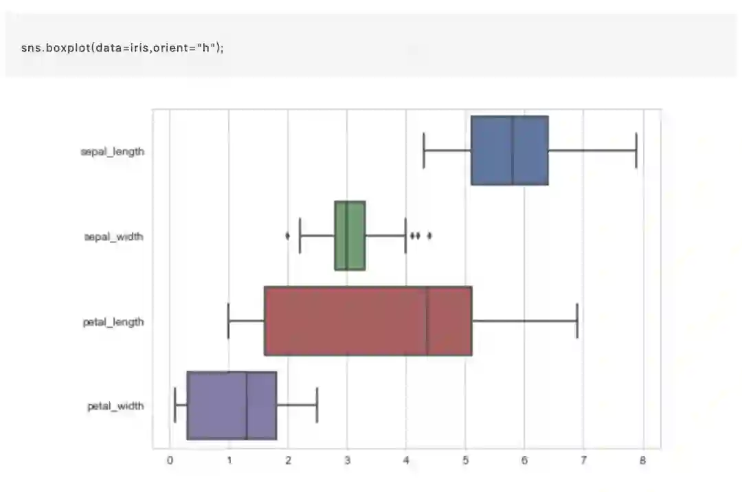 第一个是熟悉的 boxplot()。这种图形显示了分布的三个四分位值与极值。“晶须” 延伸到低于和低四分位数的 1.5 IQR 内的点,然后独立显示落在该范围之外的观测值。 重要的是,这意味着 boxplot 中的每个值的显示都对应于数据中的实际观察值: