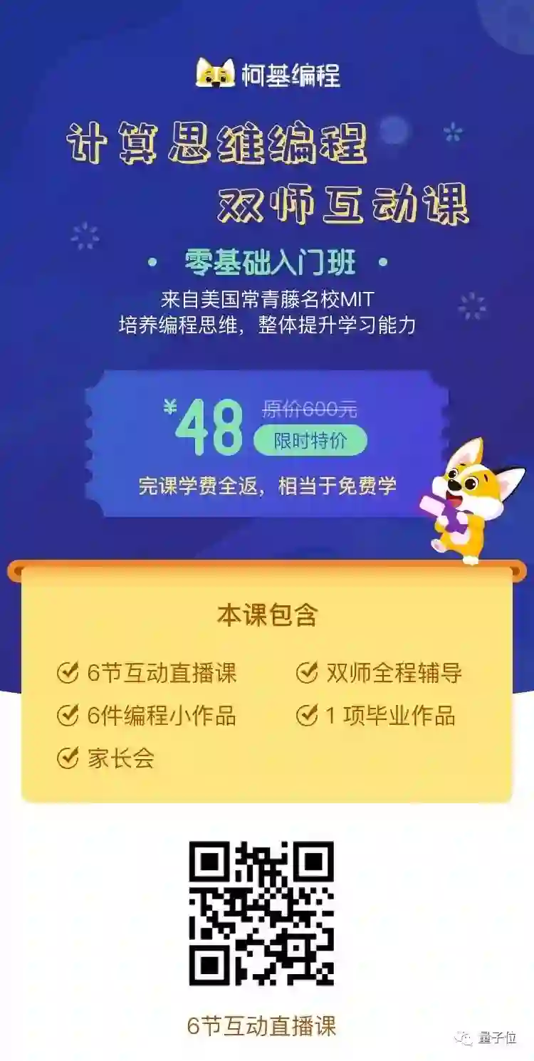柯基少儿编程入门课限时优惠招生,2020年2月17日、29日两个开课时间可选,一共七个课时,现在只需48元,而且学完课程学费全返!