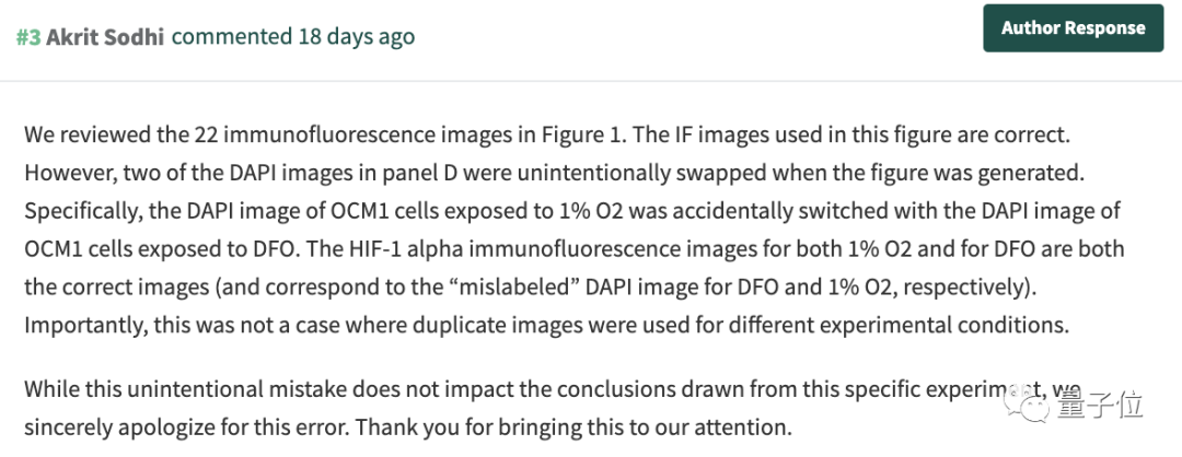 作者表示,生成图像时确实有两张图被无意间交换了位置,但该错误并非在不同的实验条件下重复使用图像。并且,作者认为这样的错误并不影响实验得出的结论。