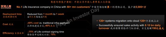 科技对内能够加强场景应用,助力业务降本增效,强化风险管理,打造客户极致体验,提升业务竞争力,比如平安云能帮助平安人寿降低40%成本,节约系统部署时间,提高效率;再比如AI技术运用于产险反欺诈和理赔等。